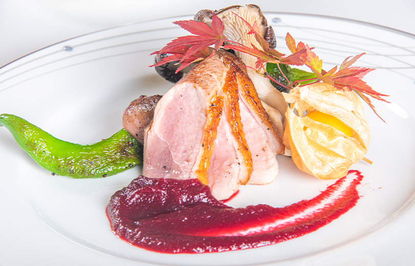 鴨胸肉のロティ 牛蒡のソースとビーツのピューレ 栗とキヌアの焼きリゾット